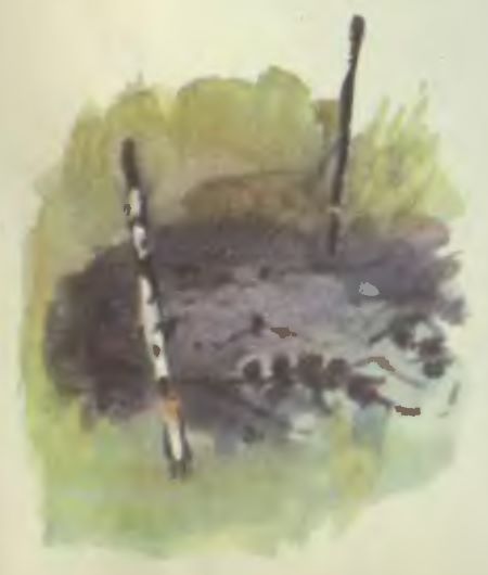 Дальше пошли, смотрят — зола от костра. Здесь Толя сидел, закусывал. Две палочки в землю воткнул — свои носки сушить вешал.