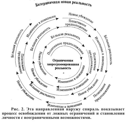 Чтобы отвергнуть (или нейтрализовать) негативное программирование, вы должны обратить спираль вспять, повернуть ее наружу (см. рис. 2), в направлении от вашей ограниченной запрограммированной реальности, выбирая положительные предположения, которые ведут к позитивным изменениям в поведении, в свою очередь способствующим возникновению более предпочтительных предположений, и т. д.