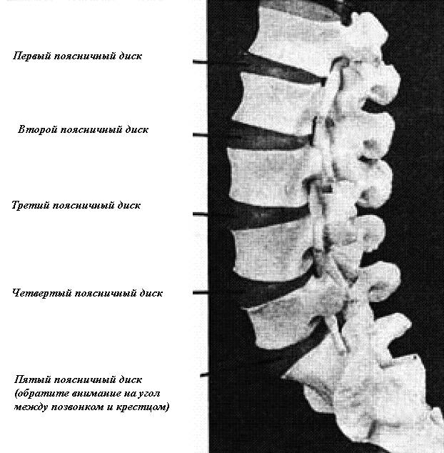 Рис. 24. На модели поясничных позвонков видны раскрытые передние межпозвонковые пространства и часть нижнего изгиба позвоночника