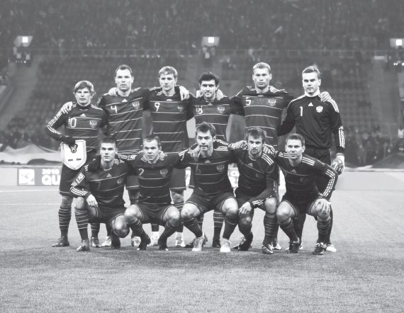 Состав сборной России. В воротах остался Игорь Акинфеев, несмотря на то что именно его ошибка привела к забитому мячу в матче со словаками. Но тренер доверяет этому игорку и уверен в нем, а слабые матчи и ошибки бывают у каждого. В обороне: на флангах слева – Юрий Жирков, справа – Александр Анюков, в центре – Василий Березуцкий и Сергей Игнашевич, бессменные часовые защиты российской команды. В полузащите: на позиции – зенитовец Игорь Денисов, на флангах слева – Андрей Аршавин, справа – Алан Дзагоев, в центре – Роман Широков и Константин Зырянов. В атаке на позиции центрфорварда – Александр Кержаков.