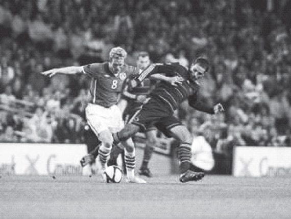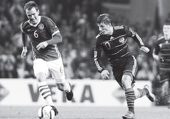 Однако такое положение, как показал матч с Ирландией, явно не на руку сборной России. Возросла нагрузка на линию обороны нашей команды, и не выдержал опытный Игнашевич. Российский защитник получил желтую карточку, а в ворота сборной России назначен пенальти. Несмотря на мощный и точный удар, Акинфеев оказался на высоте.
