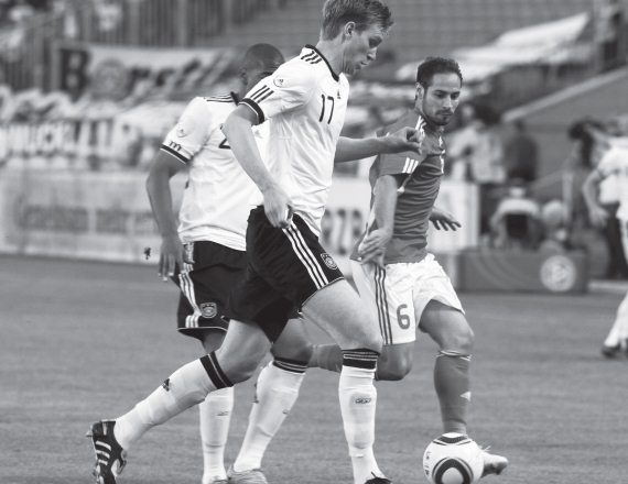 Болтизар Бодор (справа) борется с Пером Мертезакером (товарищеский матч Венгрия – Германия)