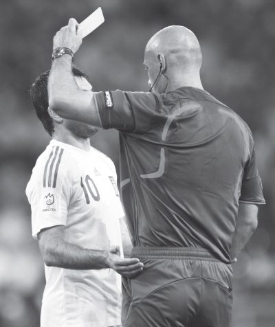 Игрок сборной Греции Георгиас Карагунис получает желтую карточку