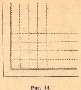 Платок со «строчкой» и «продернутой ниткой». На выровненном квадрате материи, отступя от края на 2 сантиметра, наметьте внутренний квадрат и начните выдергивать нитки в таком порядке, чтобы из трех намеченных ниток одна средняя осталась, а две нитки по обе ее стороны оказались выдернутыми. Оставшуюся среднюю нитку слегка выдерните с одной стороны и привяжите к ней цветную нитку. После этого с противоположной стороны начинайте ее осторожно тащить, и таким образом вы продернете цветную нитку. Цветные нитки можно расположить в разных сочетаниях и разным рисунком. Можно разделить весь платок на цветные квадраты, можно дать цветные нити отдельными кустиками по несколько нитей вместе, можно их чередовать по 2—3 группы, образуя правильные квадраты. Закончив продергивание ниток, слегка закрепите их, но не натягивайте слишком туго. Затем приступите к «строчке» (рис. 14).