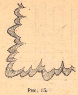 Положив платочек против себя, начинайте обметывать рисунок «петелечным швом». Нитки должны ложиться одна к другой плотно и равномерно, начинаться на одном расстоянии от края и кончаться у нарисованного края фестона. Нитки могут быть любого цвета, но в тон материи. После того как фестоны закончены, платок надо осторожно вырезать вдоль края фестонов (рис. 15).