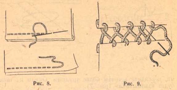 Положив два подрубленных куска материи один против другого на желаемом расстоянии, захватывайте верхнюю часть кромки рубца и, перекинув нитку петлей так, чтобы она лежала внизу и вправо