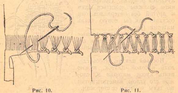 «Строчка» (рис. 10) требует большой предварительной работы. Начните с того, что выровняйте материю по вытянутой нитке, затем, наметив расстояние в 1 сантиметр от края платья, куда решено вшить полосу, выдерните от трех до пяти ниток, в зависимости от толщины ниток материи.