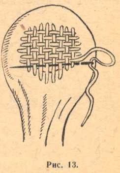 снова швом «вперед иголку» прошейте ткань вдоль порванного места, закрепите нитку и начинайте шить в противоположном направлении поперек положенных раньше ниток, набирая их на иголку через одну. Таким образом, у вас получается решетка. Поперечные нити должны ложиться одна к другой без интервалов, они составят как бы новую ткань материи (рис. 13).Хорошо усвоив показанные швы, можно приступить к целому ряду других рукодельных работ.