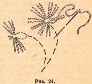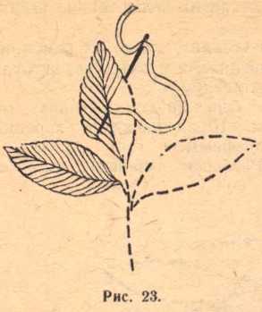 Нитка может идти, создавая рисунок, одинаковый с обеих сторон (правой и левой). Игла, проходя сверху вниз с одного края лепестка или листика, выходит на противоположном его крае. Этот способ мало экономен, так как ниток идет вдвое больше, хотя рисунок получается выпуклее. Другой способ более экономный. Игла перекидывается с одного края рисунка на другой и, пройдя наизнанку, выводится наружу на той же стороне. Отступя на одну нитку, она перекидывается на противоположную сторону. При этом способе на левой стороне виден только контур рисунка в виде мелких стежков (рис. 23).