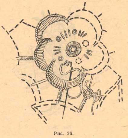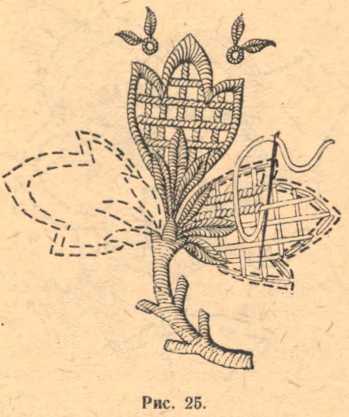 сетку-паутинку плотной навивкой. После сетки приступите к обметке и настилу для «выпуклой глади». Затем сделайте все остальные части рисунка. Последней частью работы будет вырезывание рисунка (рис. 25).