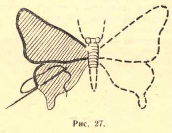 Когда закончено всё полотнище занавески, заделаны верх, низ и бока, приступите к узору. По задуманному рисунку на занавеску на правую сторону нашейте батист. На батист нанесите рисунок, который обшейте плотным «петельчатым швом». Затем аккуратно вырежьте по внешнему краю «петельчатого шва» лишнюю материю, и на тюле останется контур рисунка. На такой занавеске, повешенной на окно, будет красиво выделяться аппликация (рис. 27).