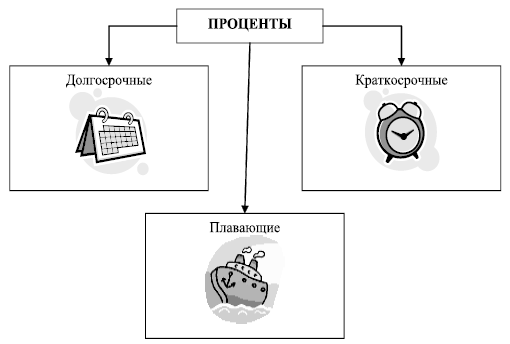 В зависимости от срока ссуды ставки процента подразделяются на краткосрочные и долгосрочные. Существует также плавающая процентная ставка – ставка процента по среднесрочным и долгосрочным кредитам, величина которой не фиксируется на весь срок кредита, а пересматривается через согласованные между кредитором и заемщиком интервалы времени в зависимости от изменения рыночной конъюнктуры и темпов инфляции.