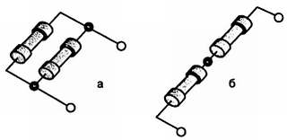 Например, при параллельном соединении резисторов (рис. 13.1) вы получите половину их общего сопротивления, то есть, если вы параллельно соединяете два резистора сопротивлением 100 Ом, вы получите 50 Ом, 220 кОм — 110 кОм и т. д. При последовательном соединении резисторов вы получите сумму их сопротивлений, то есть, если вы соединяете два резистора сопротивлением 100 Ом, вы получите 200 Ом, если 220 кОм — 440 кОм и т. д.