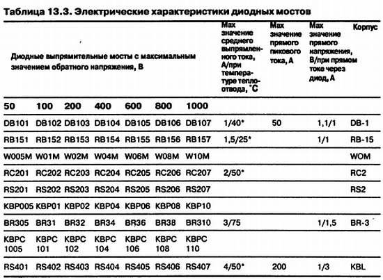 Зарубежные мосты (рис. 13.3) почти всегда имеют металло-пластиковую конструкцию корпуса. Выводы этих мостов либо пластинчатые жесткие, рассчитанные на разъемное соединение с помощью стандартных наконечников, либо проволочные жесткие луженые для монтажа пайкой. Некоторые мосты имеют в корпусе отверстие, это значит, что мост рассчитан на крепление к теплоотводу. Маркировка мостов нанесена на верхнюю или боковую поверхность корпуса. У большинства типов мостов там же указана их цоколевка. Электрические характеристики диодных мостов представлены в табл. 13.3.