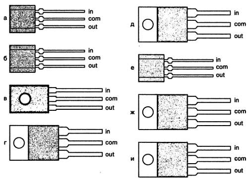 Рис. 13.4. Внешний вид и цоколевка микросхемных стабилизаторов.