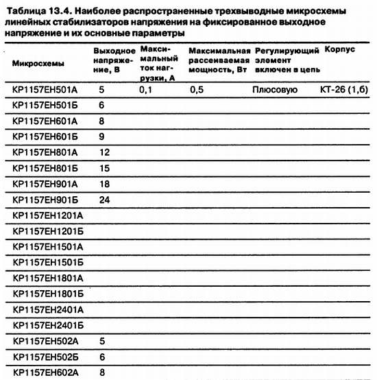 В табл. 13.4 представлен перечень наиболее распространенных на отечественном рынке трехвыводных микросхем линейных стабилизаторов напряжения на фиксированное выходное напряжение и их основные параметры.
