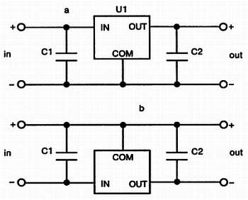 Для всех микросхем керамических или оксидных танталовых конденсаторов емкость входного конденсатора С1 должна быть не менее 2,2 мкФ, для алюминиевых оксидных конденсаторов — не менее 10 мкФ, а выходного конденсатора С2 — не менее 1 и 10 мкФ соответственно. Некоторые микросхемы допускают и меньшую емкость, но указанные значения гарантируют устойчивую работу любых стабилизаторов. Роль входного может исполнять конденсатор сглаживающего фильтра, если он расположен не далее 70 мм от корпуса микросхемы.