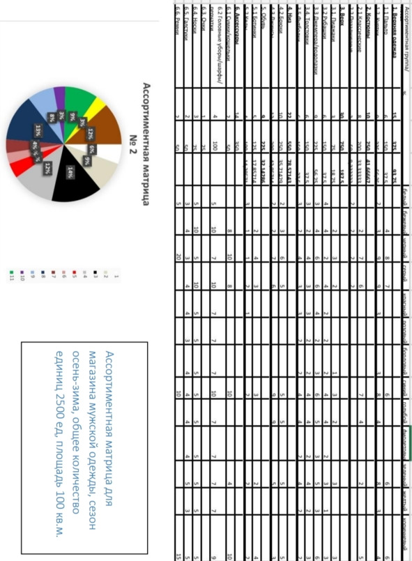 В первой колонке располагаются ассортиментные группы и подгруппы, во второй колонке % содержание каждой группы (рассчитываем от 100 %), в третьей колонке рассчитываем количество единиц каждой группы путем умножения общего количества единиц магазина на ее содержание в %, в четвертой колонке получившиеся количество единиц каждой группы делим на количество вещей в размерном ряду (например 4: S,M,L, XL),