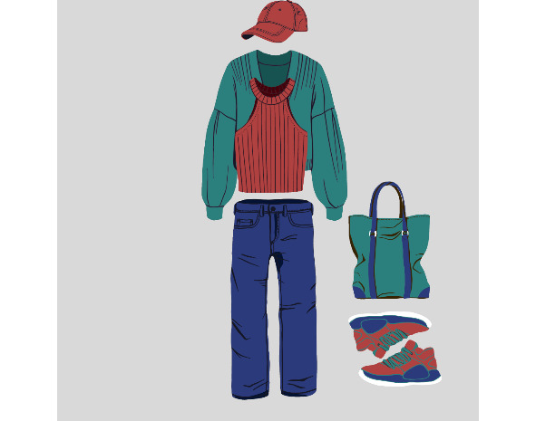 1. Три элемента верхней одежды разных цветов (Трикотажный кардиган, Джинсовая куртка, Пальто).