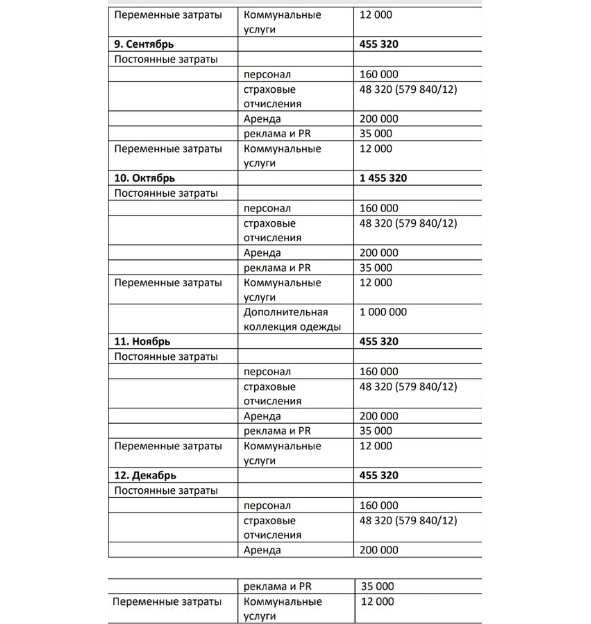 Таким образом, мы видим, что 3 месяца в году принципиально отличаются, в первом месяце (месяц открытия) у нас есть первоначальные затраты и траты на закупку первой коллекции, пятый месяц так же содержит закупку коллекции (второй), а десятый месяц — дополнительную закупку коллекций.