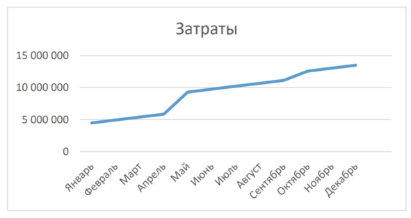 Покажем, как растут наши затраты в течении года, для этого снизу расположим значения месяцев, а сбоку сумму затрат. При этом график всегда будет идти вверх, потому что затраты будут накапливаться. Рис. 10