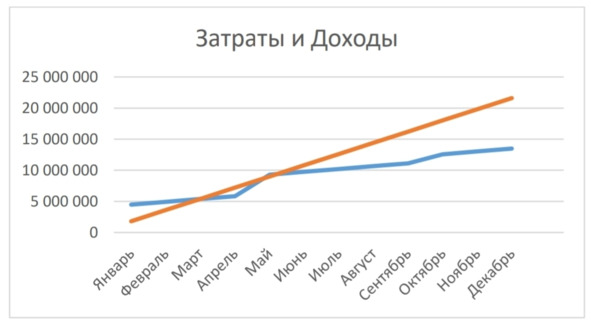 По графику мы видим, что в 6 месяце наши доходы начинают превышать расходы, это значит, что ваш бизнес начал приносить прибыль.