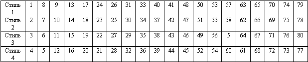 В таблице приведенной ниже, обведите те номера, на которые вы ответили положительно, и подсчитайте количество набранных вами баллов по каждому из четырех стилей. При этом один положительный ответ равен одному баллу. Максимальное количество баллов по каждому стилю может быть 20. Сумма баллов по четырем стилям должна быть равна 40.