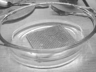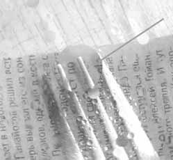 Вот такая миска, и на дне газета. А сверху плавают капельки масла.