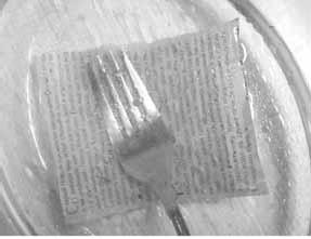 Чтобы опыт не зависел от кулинарии, возьмем любую миску, нальем воды и капнем несколько капель обычного подсолнечного масла. Я еще положил на дно газету и прижал ее вилкой. Чтобы было видно, увеличивается текст или нет.