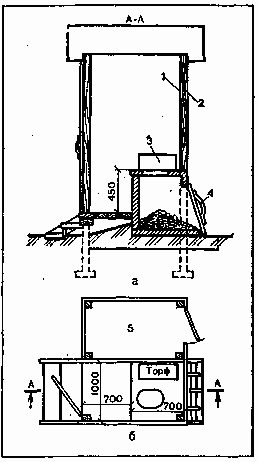 Пудр-клозет (рис. 12) строят в отдельном помещении теплой части жилого дома, обычно примыкающей к кухне. Плотный приемник-ящик пудр-клозета (деревянный или металлический) состоит из дна, верхней части — сиденья (стульчака) с отверстием, закрываемым крышкой, четырех стенок, из которых задней служит приставная крышка.