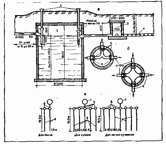 а — схема; б — распределительные колодцы для различного расположения дренажных труб; в — схема полей подземной фильтрации из двух, пяти и семи дрен; 1 — септик; 2 — прочистка; 3 — распределительный колодец; 4 — дренажные трубы; 5 — деревянный шибер