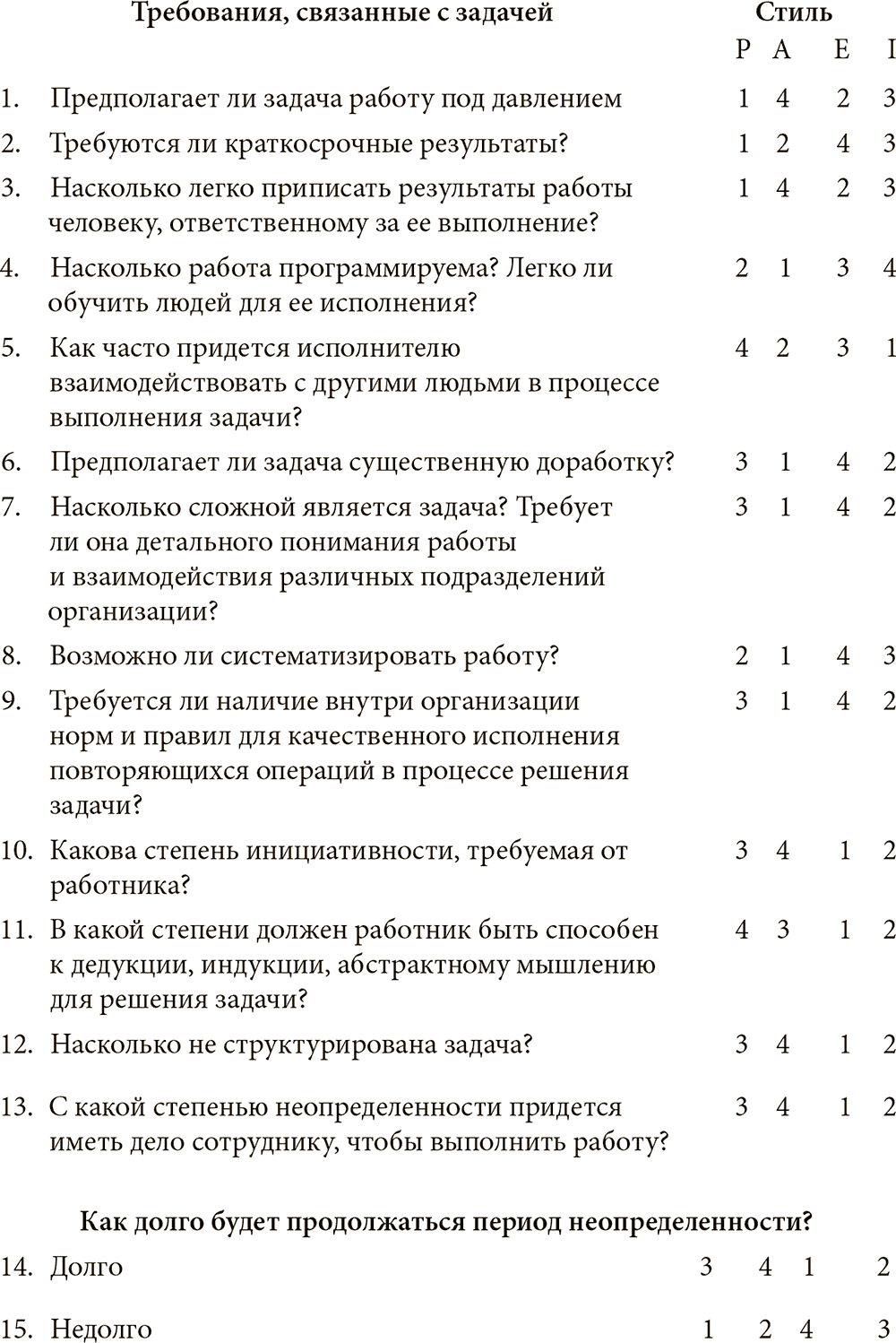 таблица – пример подхода, о котором мы говорим. Если каждому ответу на вопросы в таблице присвоить определенный вес в соответствии с конкретной задачей, то сумма значений определит, руководитель какого стиля лучше всего подойдет для ее решения.При прочих равных условиях задача из области маркетинга потребует, вероятно, больше Р и E, чем А; задача, связанная с бухгалтерией, предполагает больше А и I, чем E.