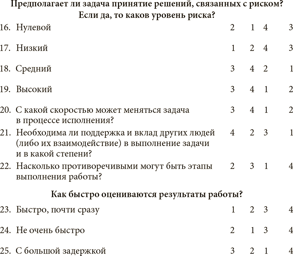 Эти 25 вопросов можно объединить в таблицу; если ответ положительный, он оценивается по шкале от 1 до 4 (1 – максимум), в зависимости от того, насколько утверждение справедливо. Это позволяет определить, какому управленческому стилю задача соответствует в наибольшей степени.