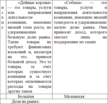 Вертикальная ось данной матрицы – это темпы роста рынка, горизонтальная – доля рынка. Четыре поля – это четыре типа продукции.