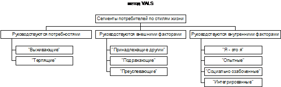 Еще одним методом сегментирования потребителей по стилю жизни является VALS (values and lifestyle – ценности и стиль жизни). По этой методике все потребители делятся на три больших сегмента (схема 1.2), которые в свою очередь имеют ряд подтипов.