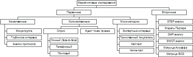 Качественные исследования: фокус-группы, глубинные интервью, анализ протокола. Количественные исследования: опрос (телефонный, личный, почтовый), аудит точек продаж. Микс-методики: экспертные интервью, hall-тест, home-тест, mystery shopping. Кабинетные исследования: STEP-анализ, модель Портера, GAP-анализ, SWOT-анализ, матрица Ансоффа, матрица BCG.