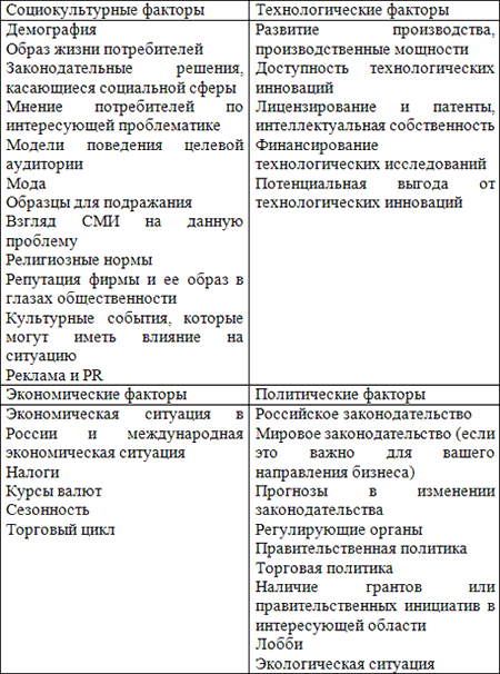 СТЭП-анализ помогает определить ситуацию на рынке и перспективы его освоения. Он показывает как возможности, так и осложняющие моменты во внешнем окружении, касающиеся продвижения существующего товара или запуска новой торговой марки.