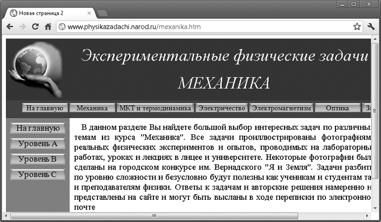 В контейнер <head></head> (с английского head переводится как «голова») помещается название документа и различная справочная информация, например ключевые слова. Сюда же добавлен контейнер <title></title>, в котором содержится название веб-страницы. Текст, помещенный в этот контейнер, отображается в заголовке окна браузера. Некоторые начинающие веб-мастера по незнанию не заполняют контейнер <title></title> или оставляют то, что прописывается по умолчанию веб-редакторами. Если взглянуть на скриншот предлагаемой ниже страницы, то можно увидеть, что она называется «Экспериментальные физические задачи. Механика», а на ее вкладке написано Новая страница 2, то есть содержимое контейнера <title></title> даже не дает намека о содержании веб-страницы (рис. 3.7).