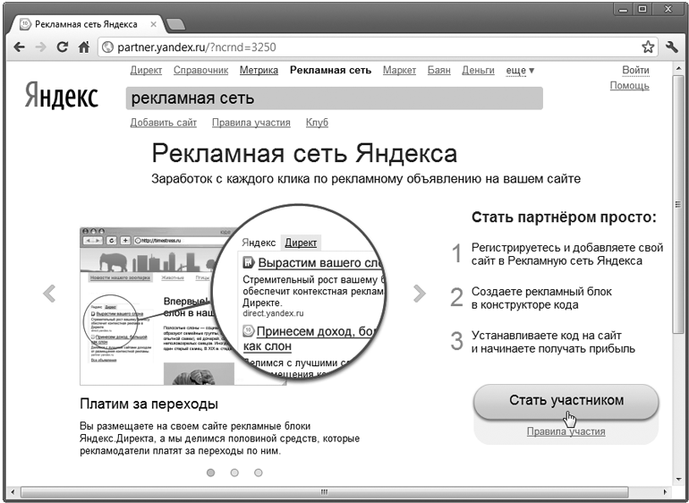 Для регистрации в рекламной сети в качестве владельца сайта необходимо пройти по ссылкеи нажать кнопку Стать участником (рис. 6.14).