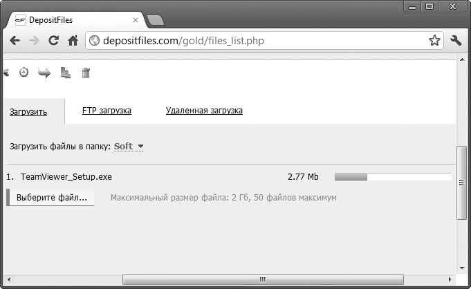 Удаленная загрузка. При этом способе можно загружать файлы на Deposit Files с других серверов Интернета. Для этого надо лишь иметь в наличии адрес интересующих вас файлов. Предлагаем вспомнить материал предыдущей главы, в которой мы создавали архивы с промо-видео. Теперь у нас есть возможность загрузить их на Deposit Files, используя удаленную загрузку. Для запуска удаленной загрузки необходимо пройти по ссылке Удаленная загрузка, ввести в поле URL-адрес файла и нажать кнопку Загрузить (рис. 8.8).