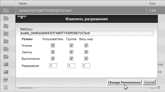 Для изменения прав доступа с помощью панели управления cPanel нужно выбрать папку в менеджере файлов и щелкнуть на значке Изменить разрешения (можно использовать контекстное меню – вызывается щелчком правой кнопкой мыши на папке). В появившемся окне следует задать права 777 и нажать кнопку Change Permissions (рис. 9.2).