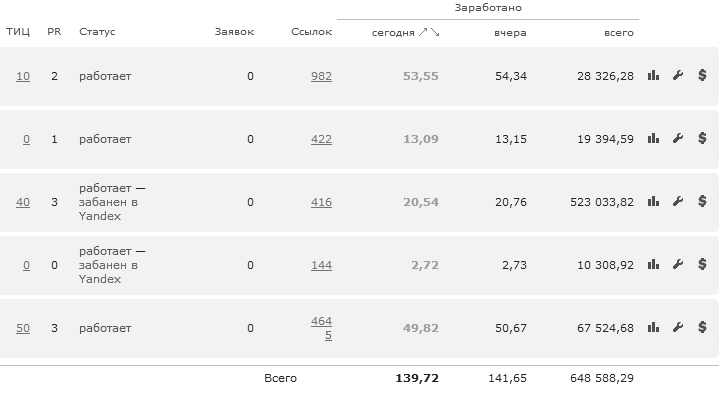 Третий по списку сайт создан в начале 2009 г., и с него за это время заработано 523 тыс. руб., то есть он себя с лихвой окупил. Несмотря на то что сайт под баном, с него все равно идет доход около 20 руб. в день.