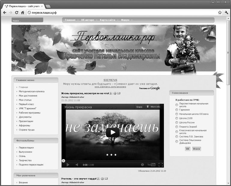 Вполне приемлем вариант создания каждому представителю семьи собственного сайта по интересующей его тематике, что и сделал один из авторов этой книги. Первый сайт создан супругой и связан с ее профессиональной деятельностью. Специально под этот сайт был куплен домен www.первоклашка.рф. Как вы понимаете, речь идет о сайте учителя начальных классов (рис. 10.3).