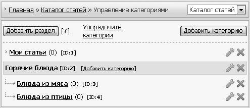 За вывод статей на сайт отвечает модуль Каталог статей. В нем можно не только создавать статьи, но и распределять их по категориям. Система uCoz поддерживает двухуровневое деление на разделы и категории. При большом количестве статей (в нашем случае – рецептов) разделы и категории сделают структуру сайта более прозрачной. Для примера создадим раздел под названием Горячие блюда, в котором будут категории Блюда из мяса, Блюда из птицы. В этом случае пользователю проще будет найти тот или иной рецепт, да и нам станет легче ориентироваться при поиске необходимой статьи.