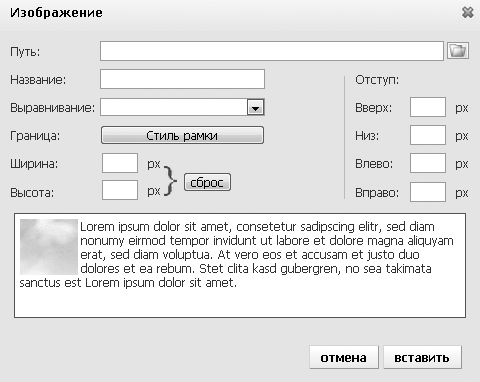 Шаг 7. Для добавления картинки в статью на панели инструментов редактора для полного текста нажимаем кнопку Изображение, после чего появляется соответствующее окно (рис. 2.21).
