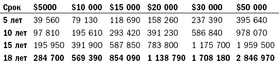 Взгляните на табл. 15. В ней указано, какую сумму можно накопить в зависимости от того, сколько инвестируется ежегодно в паевой фонд и на какой срок. Обратите внимание на то, как время инвестирования влияет на сумму. Если вы ежегодно инвестируете $10 000, то за 15 лет накопится $391 900, а за оставшиеся три года (до 18 лет) – $177 490. Почти половина того, что вы получили за 15 лет!