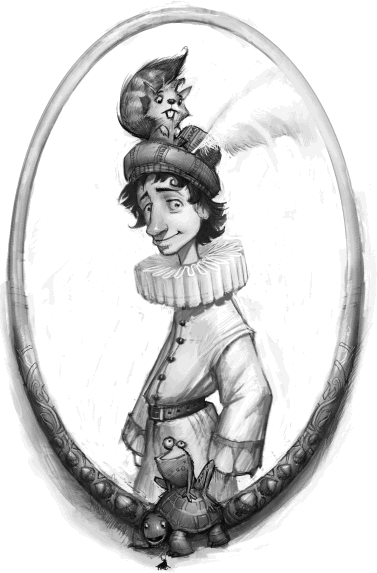 В этот миг из-за ближайших кустов выскочил какой-то человек. Все трое принцев были несколько ошарашены, как, впрочем, и незнакомец, который, заметив их, взвизгнул и подскочил, по-балетному сделав ножкой. Однако, обнаружив, что трое всадников, судя по всему, не разбойники и не чудовища, он успокоился и улыбнулся им. Незнакомец был невысокий и щупленький. На нем был синий бархатный камзол с рукавами-фонариками и белые брыжи. Из-за тугого пояса нижняя часть камзола торчала юбочкой. С плеч у незнакомца свисал короткий зеленый плащ, а черные кудри прикрывала зеленая шапочка с пером. На ногах были лосины в полоску. В продольную. Лосины в сине-зеленую продольную полоску.
