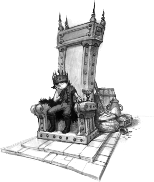Посреди всего этого великолепия высился застеленный мехами золотой трон, где и восседал Диб Раубер, Разбойничий Король. Он раскинулся на своем роскошном сиденье, перекинув одну ногу в ботфорте через подлокотник трона. Если не считать большой, не по размеру, короны, надетой набекрень, наряд у короля был скромный – поношенная серая рубаха, черная жилетка и темно-синие штаны. Сальные черные волосы торчали из-под короны во все стороны. Правый глаз сощурился на принцев (левый был закрыт красной кожаной повязкой). Однако самое поразительное в Разбойничьем Короле – такое поразительное, что обо всем остальном и говорить-то не стоит, – был его возраст. Дибу Рауберу недавно исполнилось десять.