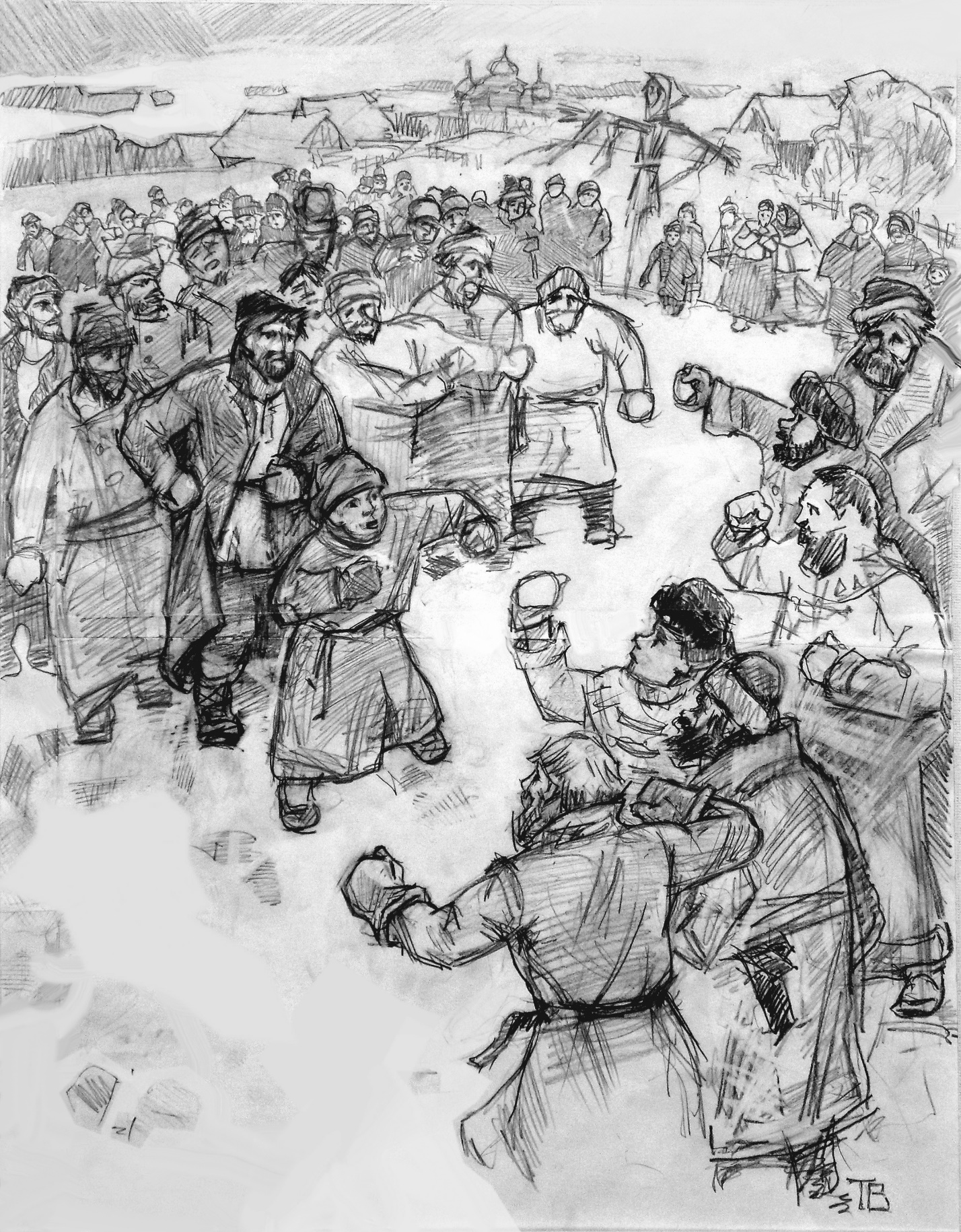 – Эй, родные, ушибу, не встанешь! – призывно орал толстый купец в шубе, подбадривая посадских. Те угрожающе поднимали кулаки и вперевалочку, будто разбуженные медведи, притоптывали да выкрикивали угрозы в сторону соперников. Городские не отставали: «Берегись, деревня! Побьём жиденьких!»