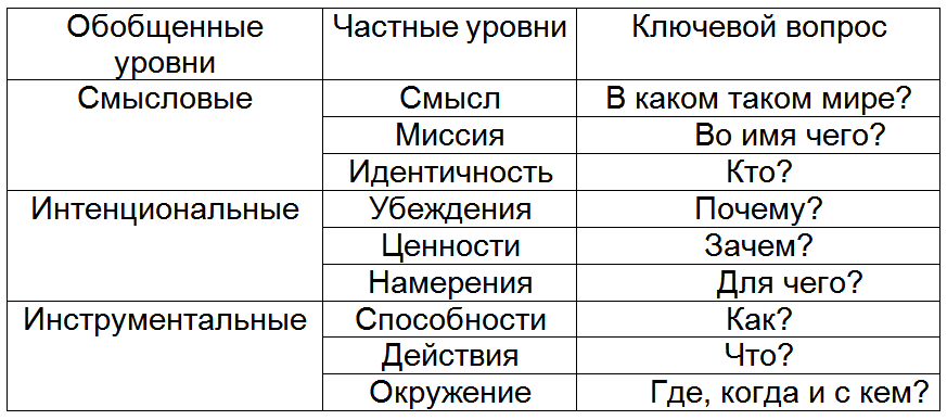 А знаете почему? Да потому, что в, так сказать, укрупненном варианте эта модель НЛУ представляет три обобщённых уровня отношений человека с его жизнедеятельностью. Инструментальный (окружение, поведение,